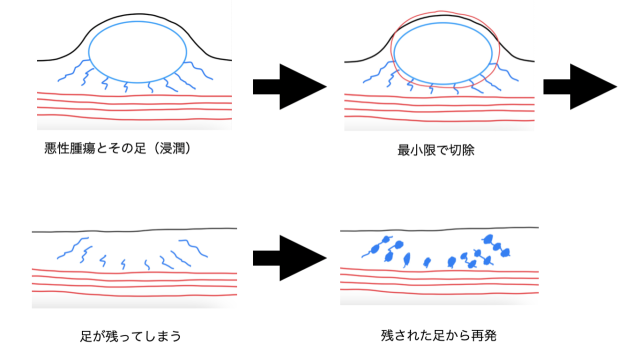 しかし、悪性腫瘍の場合は肉眼的に確認できる部位以外にも腫瘍細胞が足を伸ばしていて周囲の組織に浸潤していることが多々みられます。そのため、最小限の切除では腫瘍細胞を取り残してしまいすぐに再発してしまいます。