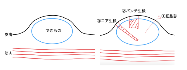 穴あけパンチのような特殊なメスでできものを切り取り病理検査をします行います。細胞診のみでは診断困難と判断した場合に行います。